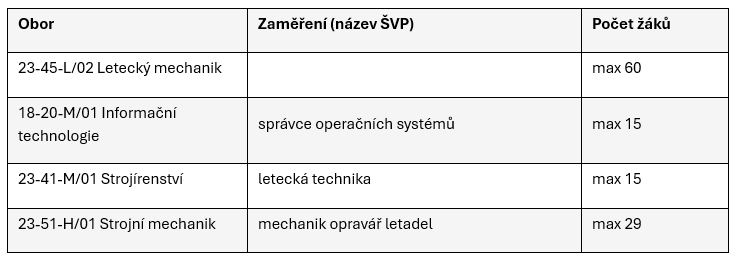 k dennímu studiu na Střední škole letecké a výpočetní techniky, U Letiště 370 do prvního ročníku bude kapacita oborů: